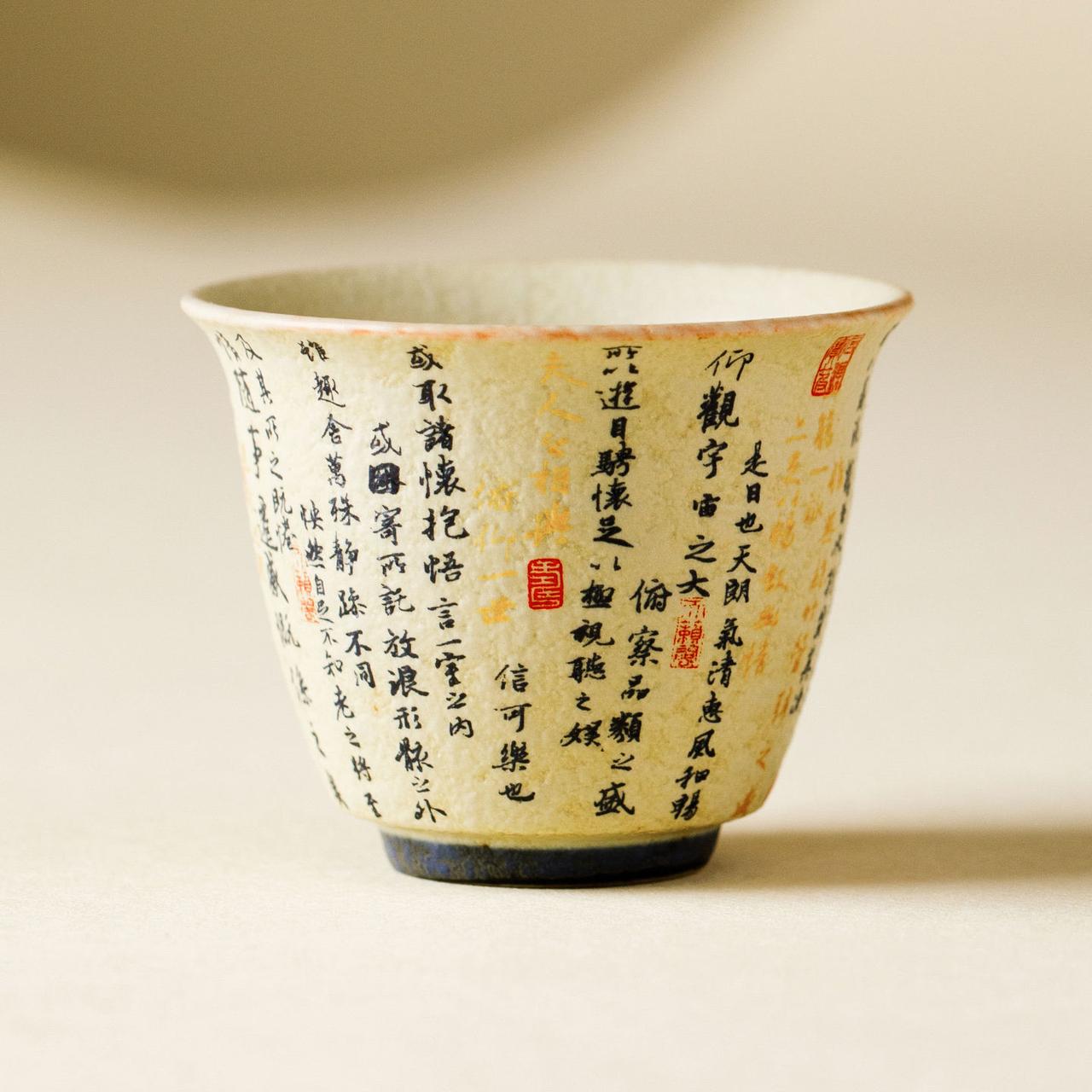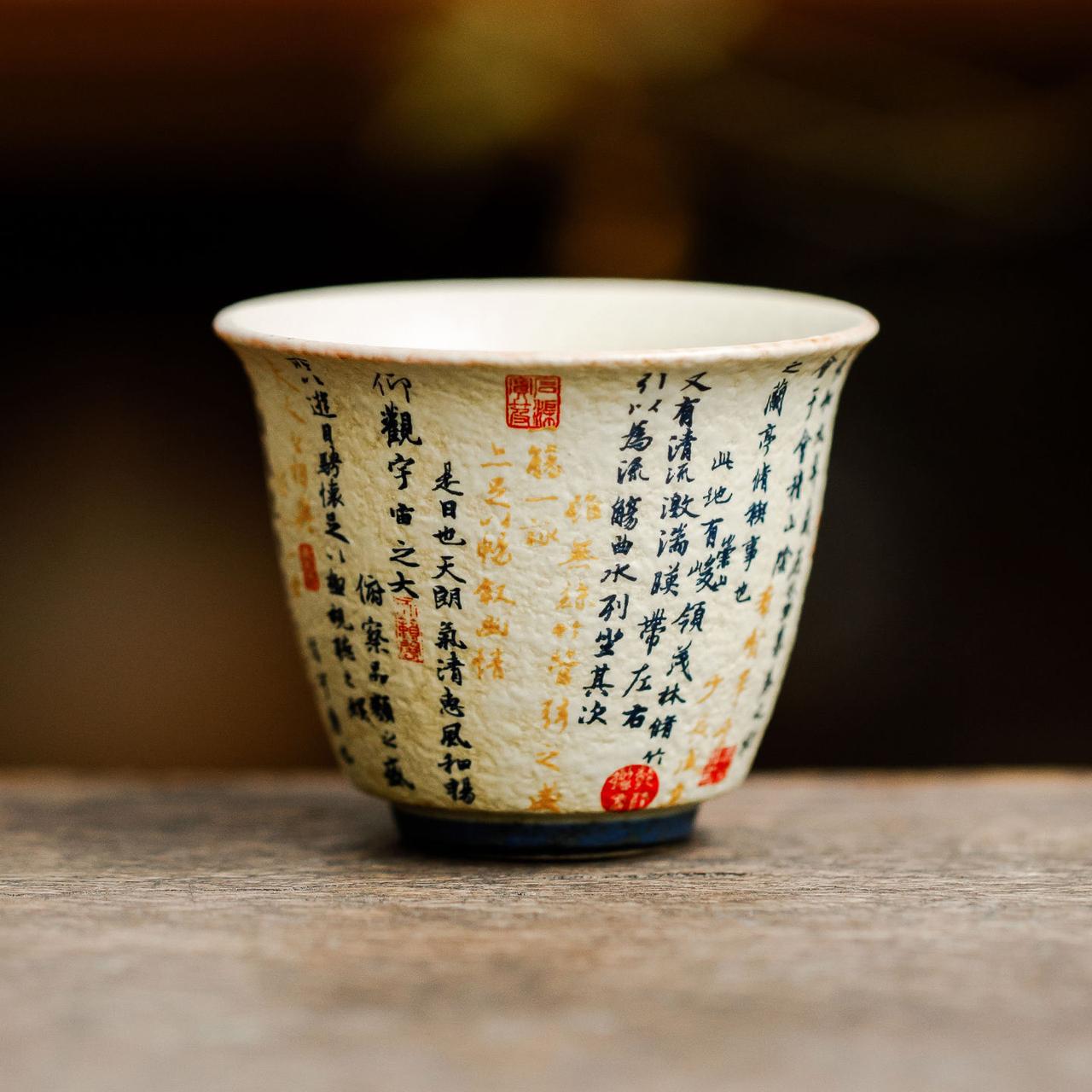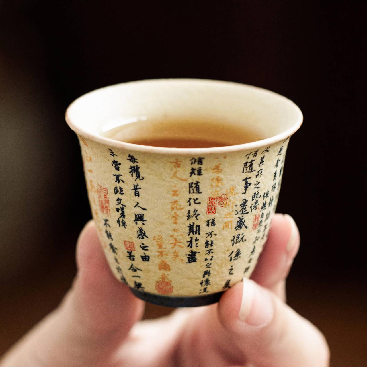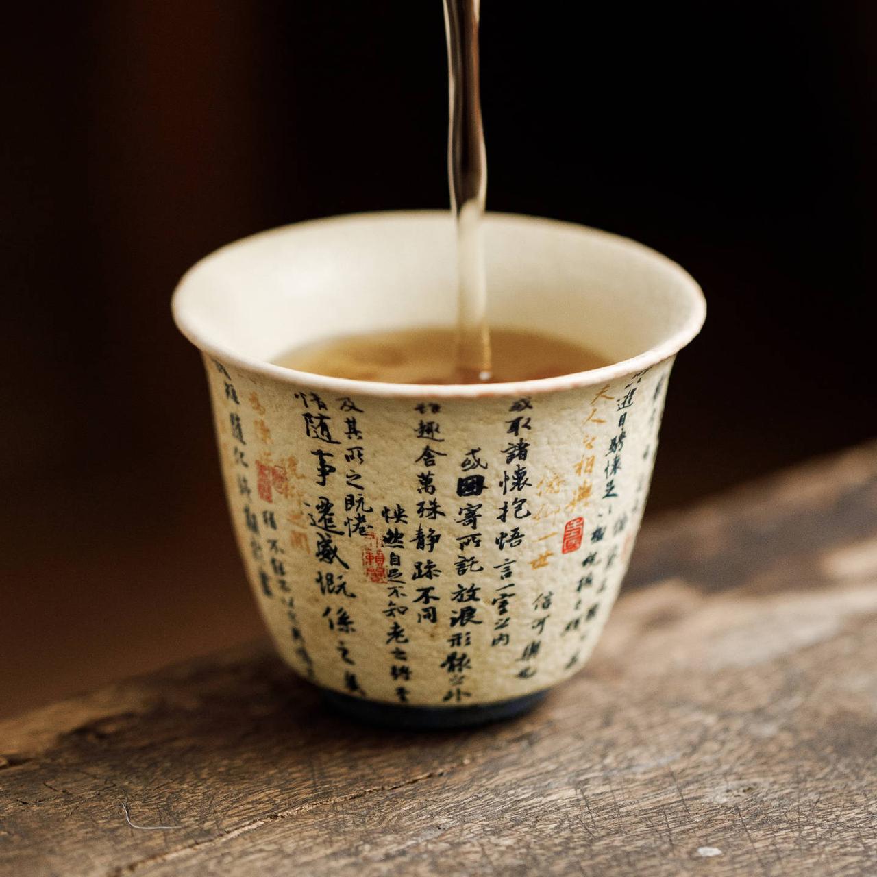 Витончена керамічна піала з традиційною китайською каліграфією та декоративним розписом у теплих відтінках. Компактний формат робить її ідеальною для дегустаційних проливів та уважного чайного ритуалу.
