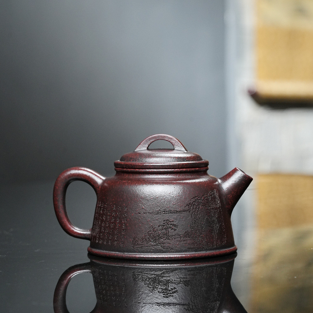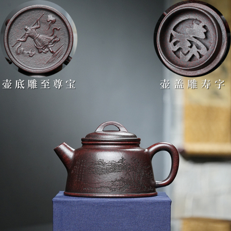 Стіни прикрашені гравіюванням дерева та написом ієрогліфами, що символізує єдність природи та людини. Такий декор перетворює чайник на атрибут роздумів і внутрішньої гармонії.